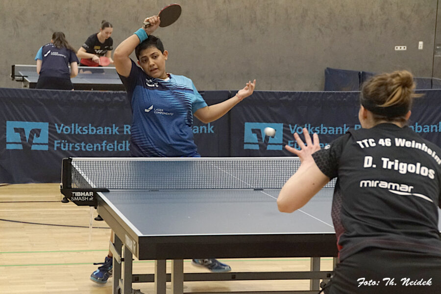 Nach diesem glanzvollen Auftakt nahm sich unser Quartett tags darauf gegen den Tabellenzweiten TTC Weinheim II einiges vor. Die Hoffnungen schwanden, als die Gäste mit einem Team eintrafen, das nach eigenem Bekunden so gut wie nie besetzt war, was beim Kader des deutschen Mannschaftsmeisters aus Baden einiges heißt. Und unsere Bedenken bestätigten sich, am Ende gab es eine 2:6-Niederlage. Siege gelangen nur Das/Burandt im Doppel sowie erneut der Inderin Das mit 3:0 gegen Minh-Thao Nguyen. Bis zum Pausenstand von 2:2 war also alles offen, doch dann entschieden mehr die Nerven als fehlende Spielkultur gegen den TuS: Anna Walter, Milena Burandt und Priyadarshini Das unterlagen jeweils hauchdünn in der Verlängerung des fünften Satzes und das teils nach Führungen und Matchbällen. Damit war die Partie gelaufen, zumal auch Steffi Felbermeier trotz guter Leistung gegen Nguyen verlor.