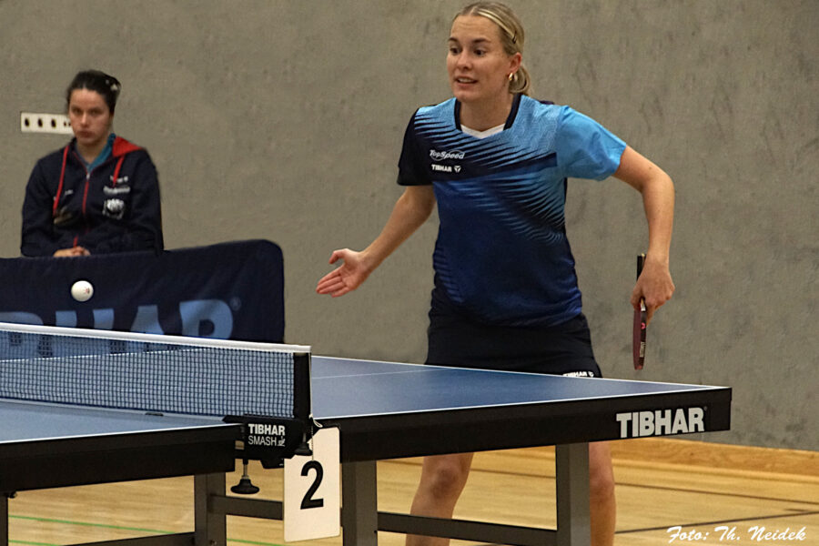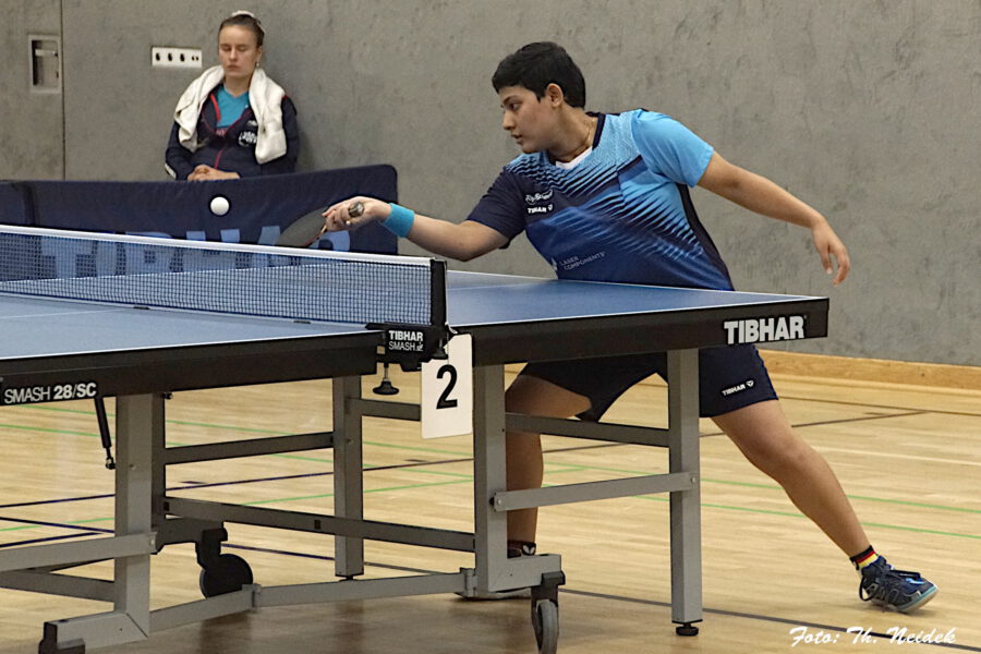 Dass in den Spitzeneinzeln Tischtennissport auf sehr hohem Niveau geboten wurde, lag aber auch an einer Spielerin im TuS-Dress: Priyadarshini Das aus Kalkutta setzte ihren Siegeszug durch die dritte Bundesliga mit zwei großartigen Partien fort. Mit ihrer Mischung aus einer extrem druckvollen Vorhand und einer unkonventionellen Rückhand mit dünnem Noppenbelag, den sie meisterlich beherrscht, zwang sie Pranjikovic und mehr noch Ernst immer wieder zu Fehlern und setzte ihren Siegeszug durch die Spitzeneinzel mit nunmehr einer 8:0-Bilanz fort.